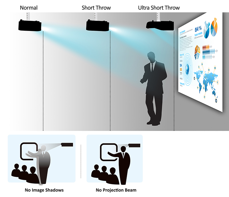 Ultra short focus, which avoid the Shadows shade problem of short and long focus projector